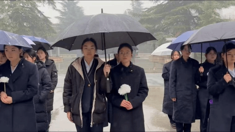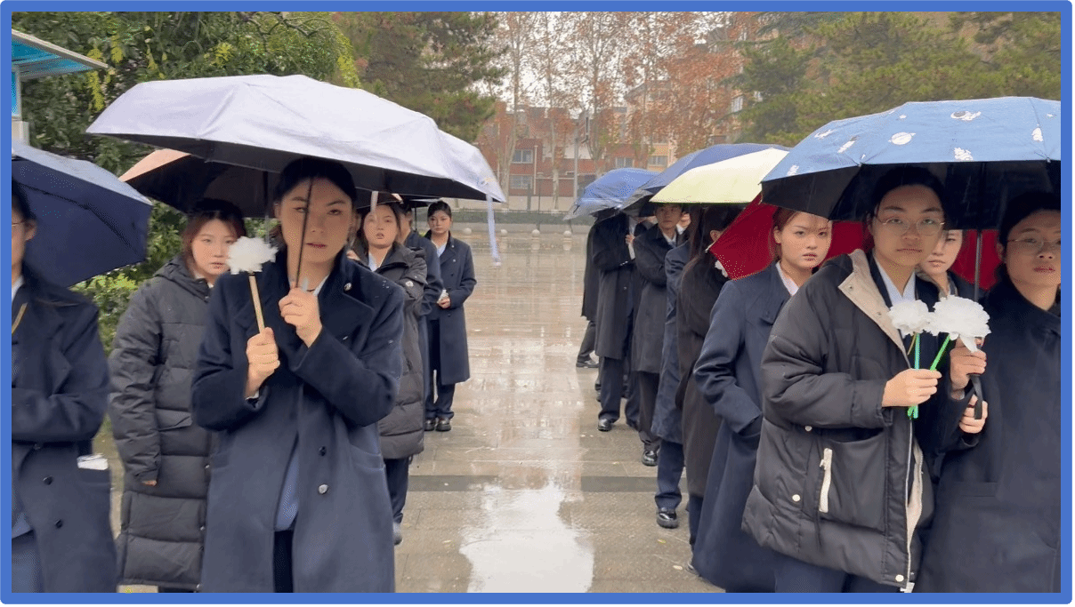 随后,全体师生默哀三分钟。师生们低头静立,雨水洒落肩头,神情凝重,用无声的敬意表达对革命先烈的深切缅怀。那一刻,时间仿佛凝固,历史的回响在每个人心中激荡……