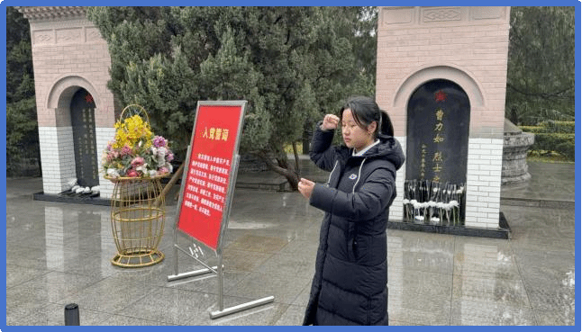在团委委员袁佳雯的带领下,全体团员重温入团誓词。她高举右拳,声音坚定而有力:“我志愿加入中国共产主义青年团,坚决拥护中国共产党的领导……”铿锵誓言在陵园回荡,字字千钧,是新时代青年对历史的回应,更是对未来的庄严承诺。