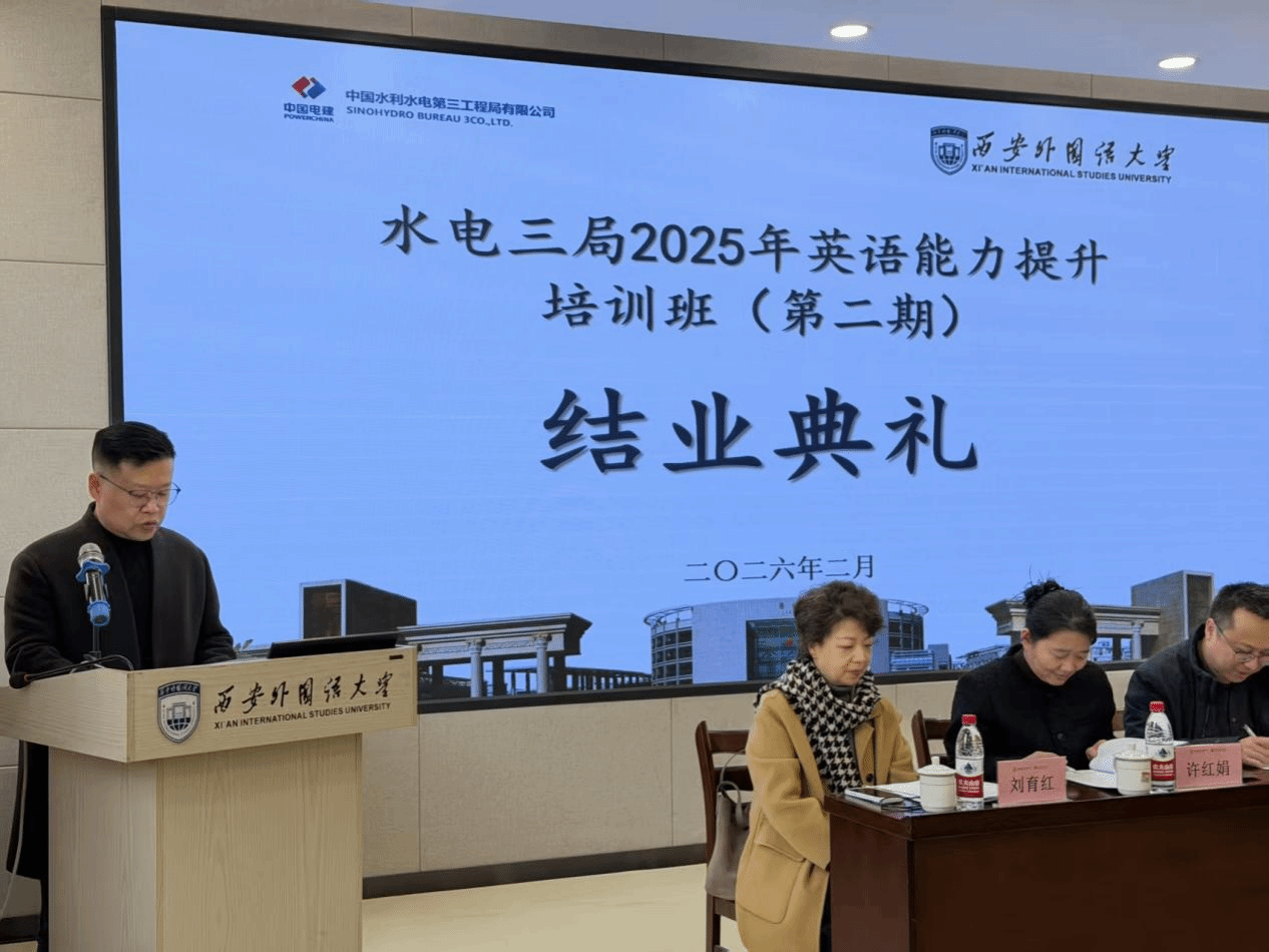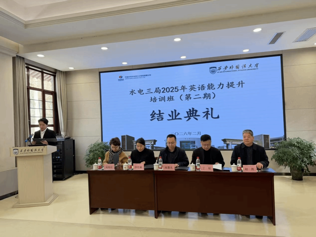 2026年2月6日下午,水电三局2025年(第二期)英语能力提升培训班结业典礼在西安外国语大学雁塔校区文化体验中心报告厅隆重举行。本次典礼标志着为期四月的专项培训圆满收官,展现了校企合作培养国际化人才的重要成果。
