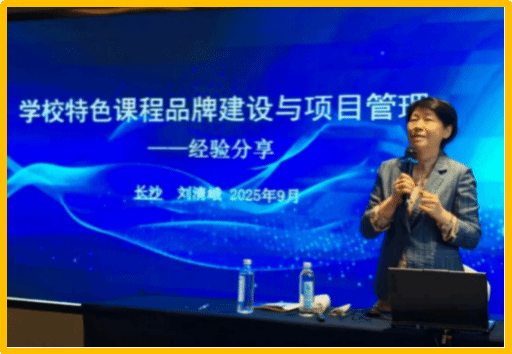 长沙麓山国际实验学校中学正高级教师刘清峨作了《学校特色课程品牌建设与项目管理》”的讲座。她以“如何让特色课程从‘有’到‘优’、从‘优’到‘品牌’”为核心问题,结合自身主持的省部级课题及学校实践案例,系统拆解了特色课程品牌建设路径。在顶层设计逻辑上,强调“国家课程校本化、校本课程特色化、特色课程品牌化”的三级递进,需立足学校办学理念、区域文化资源与学生核心素养发展需求,避免“同质化”“碎片化”。在项目管理方法方面,将课程开发视为“系统工程”,提出“全流程管控”思路,包括前期明确课程开发团队,中期建立“课程试教——反馈优化——迭代升级”机制,后期通过教材编写、成果申报、校际交流扩大品牌影响力。