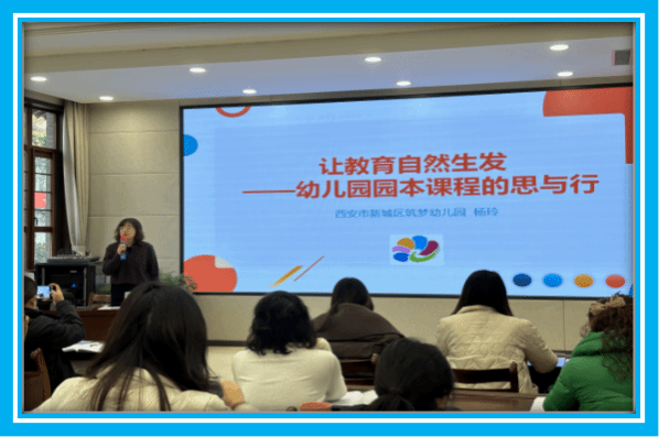 西安市新城区筑梦幼儿园党支部书记、园长、陕西省学科带头人 、教学能手、工作坊主持人杨玲为学员们作了《让教育自然生发——幼儿园园本课程的思与行》的讲座。她从课程建设的系统性出发,以深刻的教育洞察与鲜活的实践案例,诠释了“教育自然生发”的真谛,为我们解开了园本课程建设中的核心密码,并就如何将活动转化为可持续、可推广的课程资源,提出了前瞻而切实的建议。