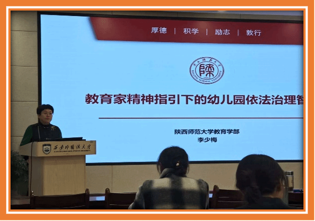 陕西师范大学李少梅教授作了《教育家精神指引下的幼儿园依法治理智慧》精彩报告。她结合典型案例,从“法是怎么形成”“法要解决什么”“法如何落实”三个方面发出,帮助园长们系统分析了《学前教育法》,深入浅出地讲解了如何在教育家精神引领下,运用法治思维完善内部治理、规范办园行为、防范法律风险、保障师生权益,为园长们提供了切实可行的治理策略与智慧。